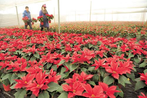 在園區(qū)的一個(gè)個(gè)花卉大棚里,到處一派忙碌的景象;紅掌、鳳梨、木槿等數(shù)萬株盆栽花卉,在經(jīng)過員工們的精心培育后,銷往北京、西安、鄭州等地的花卉批發(fā)市場(chǎng)。